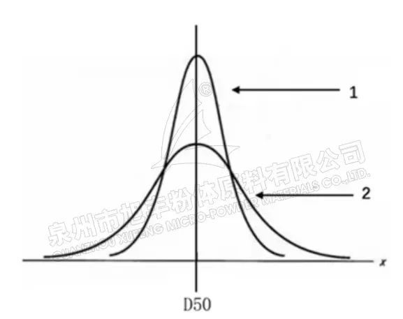 如圖所示,圖為兩個平均粒徑相同但不同粒徑分布的產(chǎn)品。產(chǎn)品1的粒徑分布較窄、最大粒徑較小,產(chǎn)品的粗顆粒較少;而產(chǎn)品2的粒徑分布較寬,最大粒徑較大,產(chǎn)品的粗顆粒多。在其他條件相同的情況下,產(chǎn)品1改性的性能好于產(chǎn)品2。粗顆粒的大小和多少對產(chǎn)品的機械性能產(chǎn)生顯著不利影響,需要嚴格控制。