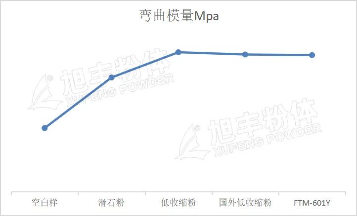 從上圖可以看出,F(xiàn)TM-601Y較滑石粉具有較高的彎曲模量,同時相對純PP樹脂來說,彎曲模量也有大幅度的提升,這說明FTM-601Y具有高模量的特性。