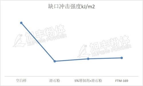 從上圖可以看出,F(xiàn)TM-169較添加5%增韌劑體系,具有較高的懸臂梁缺口沖擊強度,同時相對添加滑石粉后下降的幅度最小,這說明FTM-169在ABS樹脂中可以大大減輕因滑石粉產(chǎn)生的沖擊強度下降,具有良好的增韌效果。