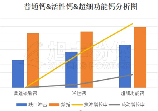 以下為經(jīng)過改性后超細(xì)功能碳酸鈣與普通碳酸鈣和活性鈣的力學(xué)性能差異性,超細(xì)功能碳酸鈣在抗沖性能與流動性方面相比普通碳酸鈣有明顯優(yōu)勢。在滿足性能的前提下,可減少配方體系中POE添加量,降低配方綜合成本。
