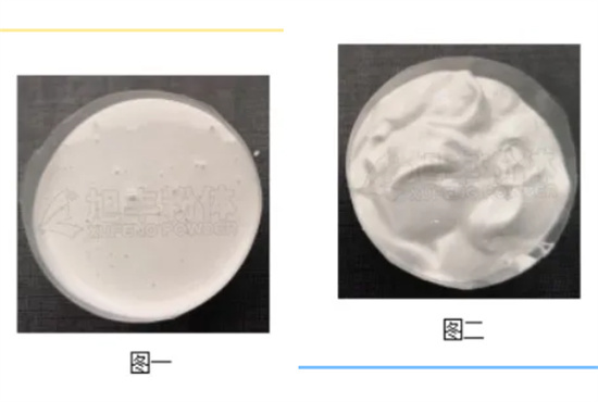 由于(攪拌或搖動)其粘度即降低的流動性質(zhì),稱為觸變性??梢酝ㄟ^粉體表面改性提高涂料體系的觸變值。由于有觸變特性,當(dāng)涂刷較厚時不會出現(xiàn)流掛現(xiàn)象,同時有儲存穩(wěn)定性好等優(yōu)點。(以下為改性前后的數(shù)據(jù)對比,圖一為1250目重鈣,圖二為DXC系列改性粉體)