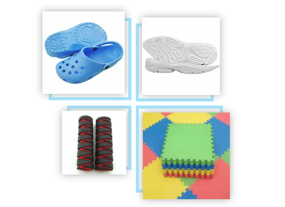 EVA發(fā)泡的表面光澤性與化學(xué)穩(wěn)定性好,具有抗老化、耐臭氧、無毒性等特點(diǎn),另外,EVA高發(fā)泡片材還具有良好的柔軟性和彈性的特點(diǎn)。故EVA發(fā)泡廣泛應(yīng)用于鞋材(拖鞋、運(yùn)動(dòng)鞋中底)、運(yùn)動(dòng)器材護(hù)套、地墊、箱包材料等。